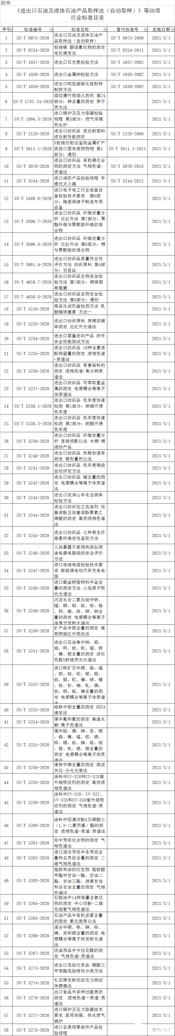 現(xiàn)發(fā)布《進(jìn)出口石油及液體石油產(chǎn)品取樣法(自動取樣)》等58項行業(yè)標(biāo)準(zhǔn)(目錄見附件)?!哆M(jìn)出口石油及液體石油產(chǎn)品取樣法(自動取樣)》(SN/T 0975—2000)等9項被代替標(biāo)準(zhǔn)自新標(biāo)準(zhǔn)實施之日起廢止。