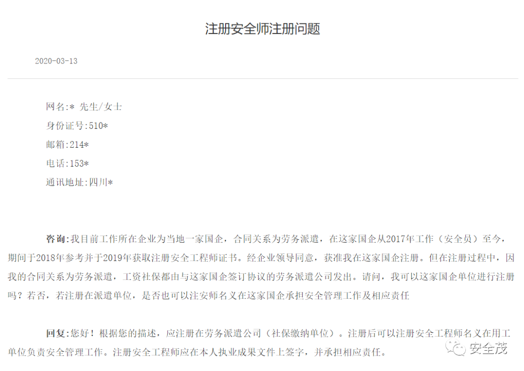 咨詢:我目前工作所在企業(yè)為當(dāng)?shù)匾患覈?,合同關(guān)系為勞務(wù)派遣,在這家國企從2017年工作(安全員)至今,期間于2018年參考并于2019年獲取注冊安全工程師證書。經(jīng)企業(yè)領(lǐng)導(dǎo)同意,獲準(zhǔn)我在這家國企注冊。但在注冊過程中,因我的合同關(guān)系為勞務(wù)派遣,工資社保都由與這家國企簽訂協(xié)議的勞務(wù)派遣公司發(fā)出。請問,我可以這家國企單位進(jìn)行注冊嗎?若否,若注冊在派遣單位,是否也可以注安師名義在這家國企承擔(dān)安全管理工作及相應(yīng)責(zé)任