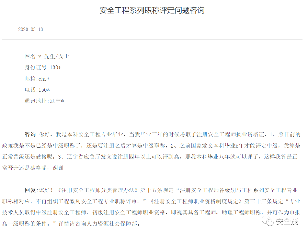 回復(fù):您好!《注冊安全工程師分類管理辦法》第十五條規(guī)定“注冊安全工程師各級別與工程系列安全工程專業(yè)職稱相對應(yīng),不再組織工程系列安全工程專業(yè)職稱評審?!薄蹲园踩こ處熉殬I(yè)資格制度規(guī)定》第三十三條規(guī)定“專業(yè)技術(shù)人員取得中級注冊安全工程師、初級注冊安全工程師職業(yè)資格,即視其具備工程師、助理工程師職稱,并可作為申報高一級職稱的條件?!痹斍檎堊稍?nèi)肆Y源社會保障部。
