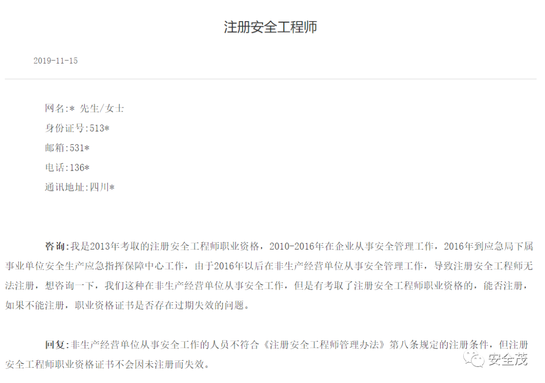 咨詢:我是2013年考取的注冊安全工程師職業(yè)資格,2010-2016年在企業(yè)從事安全管理工作,2016年到應(yīng)急局下屬事業(yè)單位安全生產(chǎn)應(yīng)急指揮保障中心工作,由于2016年以后在非生產(chǎn)經(jīng)營單位從事安全管理工作,導(dǎo)致注冊安全工程師無法注冊,想咨詢一下,我們這種在非生產(chǎn)經(jīng)營單位從事安全工作,但是有考取了注冊安全工程師職業(yè)資格的,能否注冊,如果不能注冊,職業(yè)資格證書是否存在過期失效的問題。