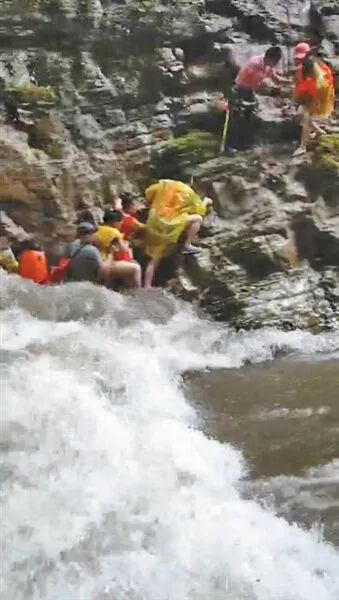 十多名游客緊貼著峭壁,用手抓著巖石才得以幸存。