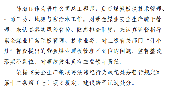 2月23日20時(shí)44分,探水隊(duì)副隊(duì)長(zhǎng)王志平通過(guò)6103回風(fēng)順槽距開(kāi)口950m處的電話,向礦調(diào)度室匯報(bào)了事故情況。20時(shí)46分,調(diào)度值班人員張宏強(qiáng)向礦長(zhǎng)郭英杰匯報(bào)事故情況。郭英杰立即啟動(dòng)應(yīng)急救援預(yù)案,組織煤礦相關(guān)人員開(kāi)展搶險(xiǎn)救援工作。救援人員使用單體液壓支柱、半圓木、鉸接梁對(duì)事故地點(diǎn)外圍巷道進(jìn)行臨時(shí)支護(hù),然后由外到里清渣、支護(hù),實(shí)施救援。被冒落頂板埋壓的劉永生、馬練水和王秀國(guó)于2月24日14時(shí)30分、2月25日6時(shí)30分、2月25日14時(shí)分別被救出升井。經(jīng)醫(yī)生在井口確認(rèn),3人已無(wú)生命體征,之后被送往榆次區(qū)殯儀館,搶險(xiǎn)救援工作結(jié)束。事故瞞報(bào)、謊報(bào)經(jīng)過(guò)2月24日,礦長(zhǎng)郭英杰安排信息中心主任梁煥修改人員定位系統(tǒng),關(guān)閉了工業(yè)視頻,刪除調(diào)度錄音通訊、虹膜數(shù)據(jù)。2月25日17時(shí)許,紫金煤業(yè)紀(jì)檢書(shū)記、黨總支副書(shū)記高建忠(臨時(shí)主持紫金煤業(yè)董事會(huì)及黨務(wù)日常事務(wù))和礦長(zhǎng)郭英杰組織召開(kāi)煤礦管理層會(huì)議。會(huì)上郭英杰、高建忠、紫金煤業(yè)安全生產(chǎn)技術(shù)總監(jiān)南海為了瞞報(bào)事故,對(duì)偽造出入井?dāng)?shù)據(jù)、修改人員定位數(shù)據(jù)、銷(xiāo)毀調(diào)度電話錄音、刪除視頻監(jiān)控資料、清理井下事故現(xiàn)場(chǎng)等事項(xiàng)進(jìn)行了安排。2月24日至25日,高建忠安排生產(chǎn)副礦長(zhǎng)杜永忠、安全副礦長(zhǎng)楊雙喜等人與遇難者家屬協(xié)商辦理賠償事宜,并安排遇難者家屬配合礦方瞞報(bào)事故。3月5日,在榆次區(qū)人民政府組織的核查過(guò)程中,郭英杰、高建忠均否認(rèn)事故發(fā)生,郭英杰、高建忠、南海繼續(xù)安排煤礦有關(guān)工作人員瞞報(bào)事故。3月8日上午9時(shí)許,在榆次區(qū)人民政府已查實(shí)事故、正在擬文上報(bào)的期間,紫金煤業(yè)向山西煤銷(xiāo)晉中公司、榆次區(qū)應(yīng)急管理局和晉中煤監(jiān)分局電話匯報(bào)事故,稱(chēng)三名巡檢人員走到事故地點(diǎn)時(shí),頂板突然冒落導(dǎo)致事故發(fā)生,謊報(bào)了事故的經(jīng)過(guò)和原因。2月23日22時(shí)左右,武全珍在井下安排王家偉完善措施內(nèi)容。王家偉出井后在措施中增加了:“頂板較完整區(qū)域補(bǔ)強(qiáng)支護(hù)期間采用單體支柱+鉸接頂梁做臨時(shí)支護(hù),頂板不平整處使用方木墊平、木楔背緊背實(shí)”,和“臨時(shí)支護(hù)安全技術(shù)措施”相關(guān)內(nèi)容。2月24日上午,武全珍安排王家偉在該措施中增加了“絞車(chē)運(yùn)輸安全技術(shù)措施”和“移動(dòng)乳化液泵使用安全技術(shù)措施”等內(nèi)容。3月8日,生產(chǎn)礦長(zhǎng)杜永忠安排探水隊(duì)隊(duì)長(zhǎng)王聚寶在班前會(huì)記錄中加上“先抽400米水”。當(dāng)天晚上,安全礦長(zhǎng)楊雙喜在在班前會(huì)記錄中加上“不準(zhǔn)進(jìn)尺,打好臨時(shí)支護(hù)再作業(yè)”等內(nèi)容。現(xiàn)場(chǎng)人員在無(wú)臨時(shí)支護(hù)的情況下違章進(jìn)行補(bǔ)強(qiáng)支護(hù)作業(yè),施工過(guò)程中頂板失穩(wěn)冒落,導(dǎo)致事故發(fā)生。1.紫金煤業(yè)對(duì)處于極限平衡狀態(tài)的6103回風(fēng)順槽頂板存在的安全隱患辨識(shí)不清、安全風(fēng)險(xiǎn)管控不力6103回風(fēng)順槽巷道埋深大、圍巖較軟,且為迎采對(duì)掘巷道,受臨近的6101工作面開(kāi)采動(dòng)壓影響大,多根錨桿錨索斷裂失效,巷道變形,底板鼓起,事故地點(diǎn)附近巷道頂板已處于高應(yīng)力的極限平衡狀態(tài)。事故發(fā)生前,事故地點(diǎn)附近巷道頂板已先后發(fā)生兩次冒落。紫金煤業(yè)對(duì)6103回風(fēng)順槽頂板存在的安全隱患辨識(shí)不清、重視不夠,未切實(shí)進(jìn)行礦壓日常監(jiān)測(cè)分析,未對(duì)斷裂失效錨桿及時(shí)補(bǔ)強(qiáng)支護(hù),施工時(shí)未采取臨時(shí)支護(hù),安全風(fēng)險(xiǎn)管控不力。2.紫金煤業(yè)技術(shù)管理工作有漏洞,《6103回風(fēng)順槽補(bǔ)強(qiáng)支護(hù)施工安全技術(shù)措施》對(duì)現(xiàn)場(chǎng)作業(yè)指導(dǎo)性差紫金煤業(yè)編制的《6103回風(fēng)順槽補(bǔ)強(qiáng)支護(hù)施工安全技術(shù)措施》對(duì)巷道補(bǔ)強(qiáng)支護(hù)作業(yè)的臨時(shí)支護(hù)形式、技術(shù)參數(shù)和要求不具體,對(duì)現(xiàn)場(chǎng)作業(yè)指導(dǎo)性差。生產(chǎn)技術(shù)科科長(zhǎng)王家偉編制措施前未到6103回風(fēng)順槽實(shí)地查看頂板情況,生產(chǎn)礦長(zhǎng)杜永忠、安全礦長(zhǎng)楊雙喜、總工程師武全珍及相關(guān)部門(mén)負(fù)責(zé)人會(huì)審措施時(shí)審查把關(guān)不嚴(yán),措施僅由探水隊(duì)隊(duì)長(zhǎng)在班前會(huì)進(jìn)行宣讀,學(xué)習(xí)貫徹不到位。3.6103回風(fēng)順槽補(bǔ)強(qiáng)支護(hù)作業(yè)勞動(dòng)組織混亂,現(xiàn)場(chǎng)安全監(jiān)管缺位事故當(dāng)班,在探水隊(duì)隊(duì)長(zhǎng)提出本隊(duì)人員不熟悉支護(hù)作業(yè)的情況下,礦領(lǐng)導(dǎo)違章指揮,仍然抽調(diào)安監(jiān)