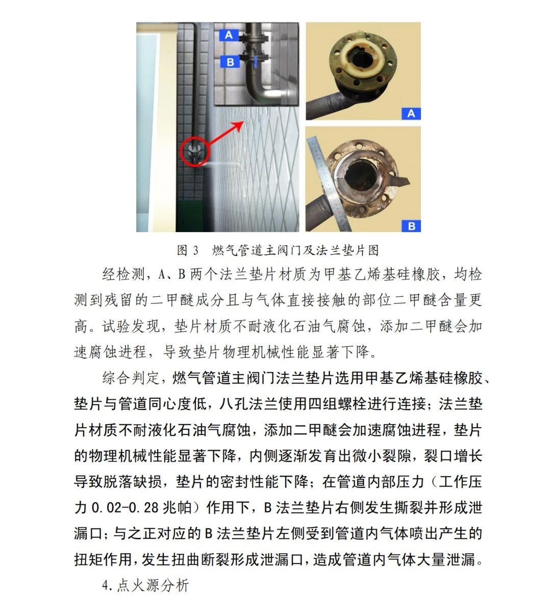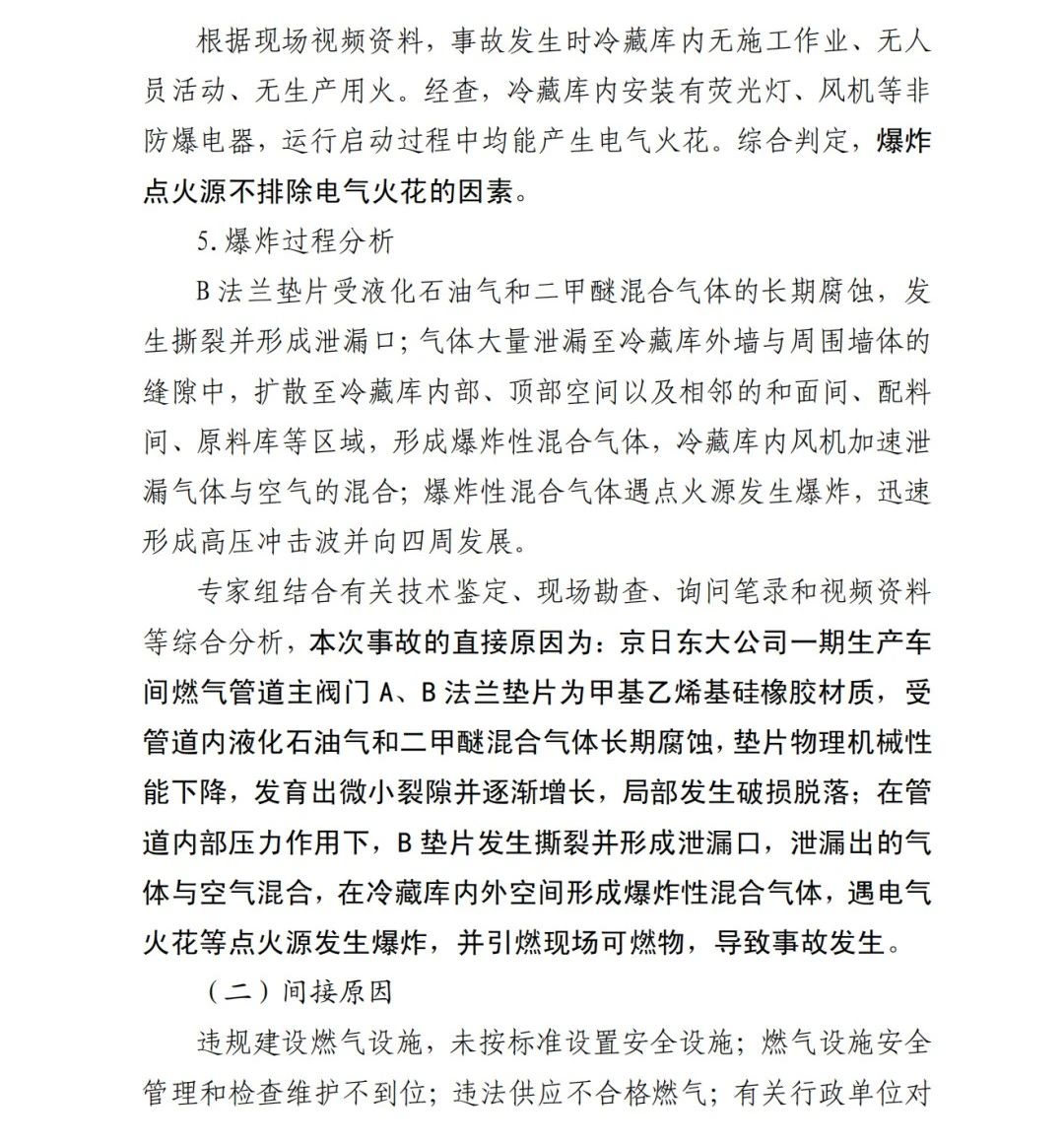 本次事故的直接原因為:京日東大公司一期生產車間燃氣管道主閥門A、B法蘭墊片為甲基乙烯基硅橡膠材質,受管道內液化石油氣和二甲醚混合氣體長期腐蝕,墊片物理機械性能下降,發(fā)育出微小裂隙并逐漸增長,局部發(fā)生破損脫落;在管道內部壓力作用下,B墊片發(fā)生撕裂并形成泄漏口,泄漏出的氣體與空氣混合,在冷藏庫內外空間形成爆炸性混合氣體,遇電氣火花等點火源發(fā)生爆炸,并引燃現(xiàn)場可燃物,導致事故發(fā)生。