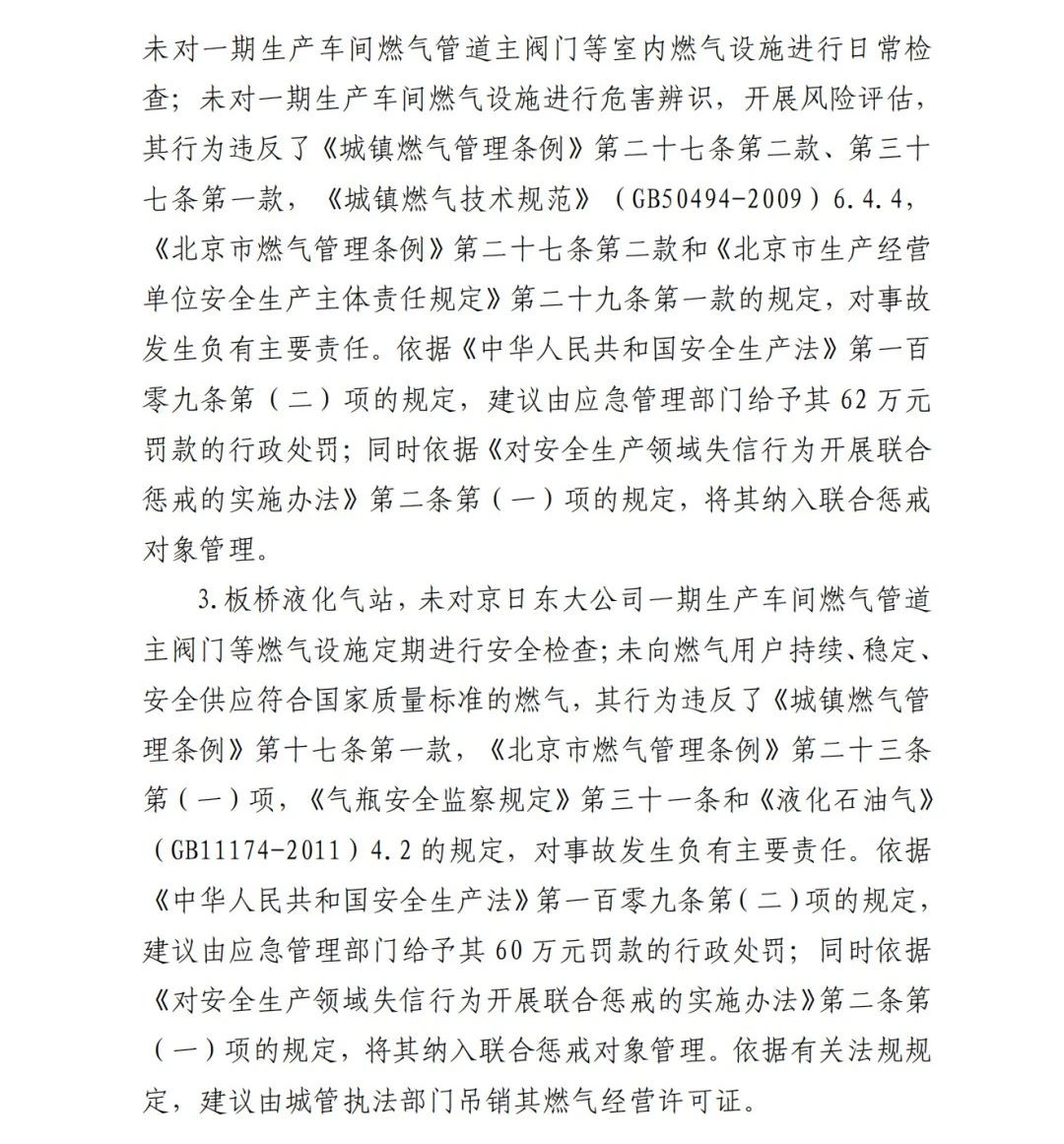 1.曾九發(fā),京日東大公司生產部部長,全面負責生產部管理工作,負責本部門的消防安全、生產安全、設備安全工作。未有效開展燃氣設施檢修維護工作,致使一期生產車間燃氣管道長期未得到維護保養(yǎng);未嚴格組織開展燃氣設施的檢查、檢測工作;未及時有效排查燃氣設施存在的事故隱患;未有效開展本部門員工的燃氣安全知識和操作技能培訓工作,對事故發(fā)生負有直接責任,涉嫌重大責任事故罪。2019 年 12 月 17 日,由順義區(qū)人民 檢察院批準逮捕。