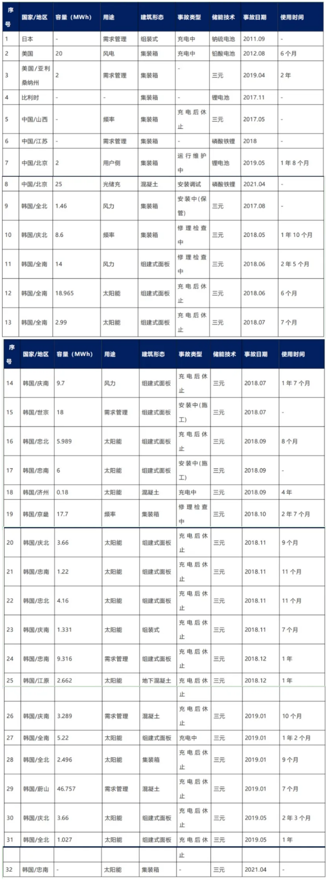 近10年間,全球共發(fā)生32起儲能電站起火爆炸事故。其中,日本1起、美國2起、比利時1起、中國3起、韓國24起。通過對行業(yè)公開信息進(jìn)行搜集整理,匯總了2011-2021年間,全球儲能項(xiàng)目主要火災(zāi)或爆炸事故。由于較多安全事故原因復(fù)雜,相關(guān)事件很多都未公開披露。