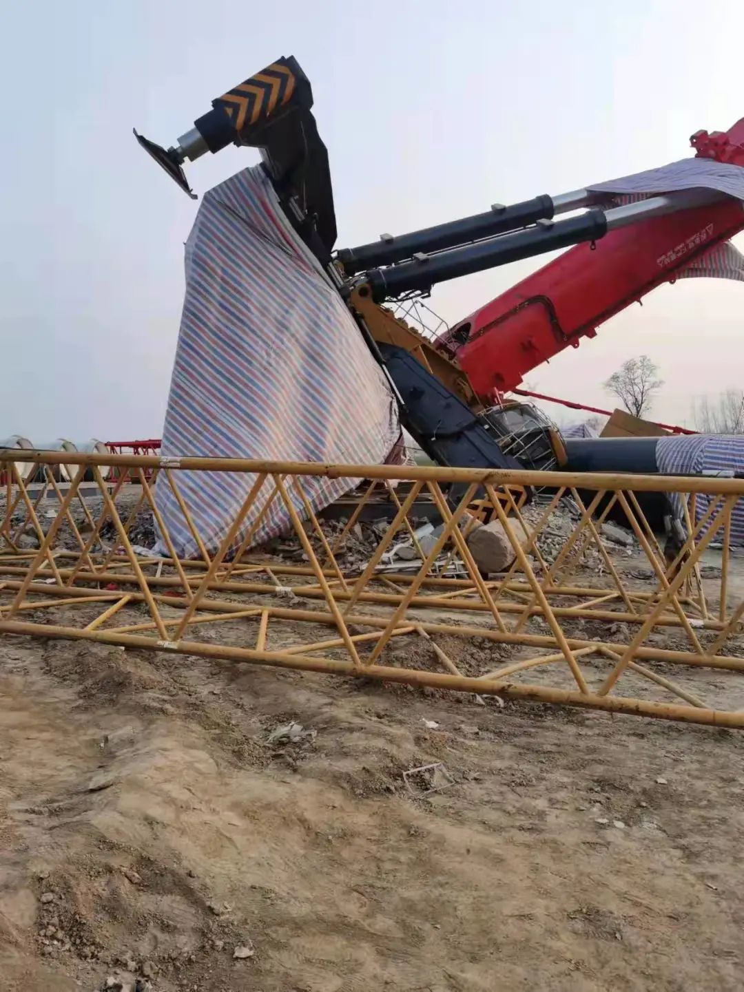 龐大的吊車摔得面目全非風機組破損嚴重,這次損失十分嚴重現場已經拉起了警戒線,吊車車身已覆蓋遮擋布
