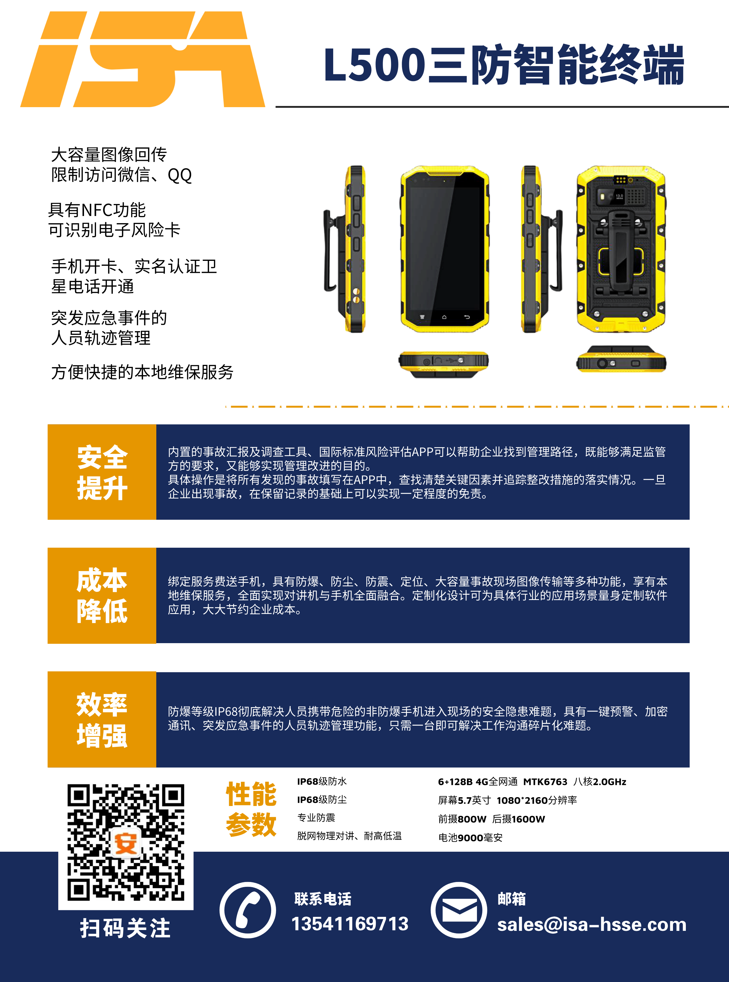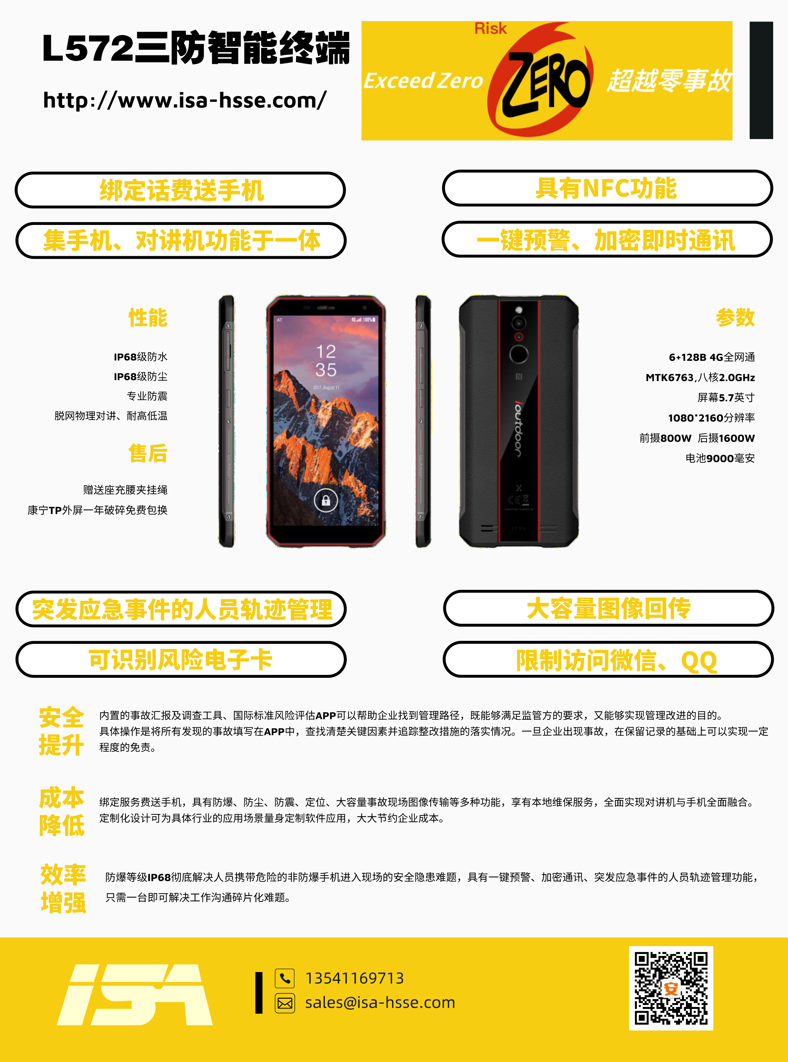 公司與運(yùn)營(yíng)商推出一款集手機(jī)、對(duì)講機(jī)于一體的防爆手持終端,包括各類商業(yè)安全軟件的使用、圖像回傳功能、一鍵報(bào)警、限制訪問(wèn)微信QQ、NFC等功能。內(nèi)含事故管理APP(隱患排查、風(fēng)險(xiǎn)評(píng)估),0元開(kāi)卡,綁定即送話費(fèi)流量,支持定制化服務(wù)。